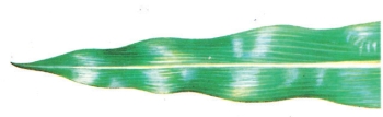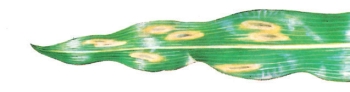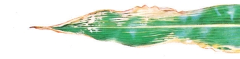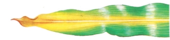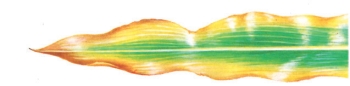 Helminthosporium blight, starts in small spots and gradually spreads across the leaf.